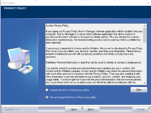 Kies "I do not accept the terms of the Privacy policy" en klik op "Next"