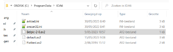 Kopieer Belpic-2-0.av2 naar "C:\ProgramData\IDA6" ==> Zie gedownloade drivers
