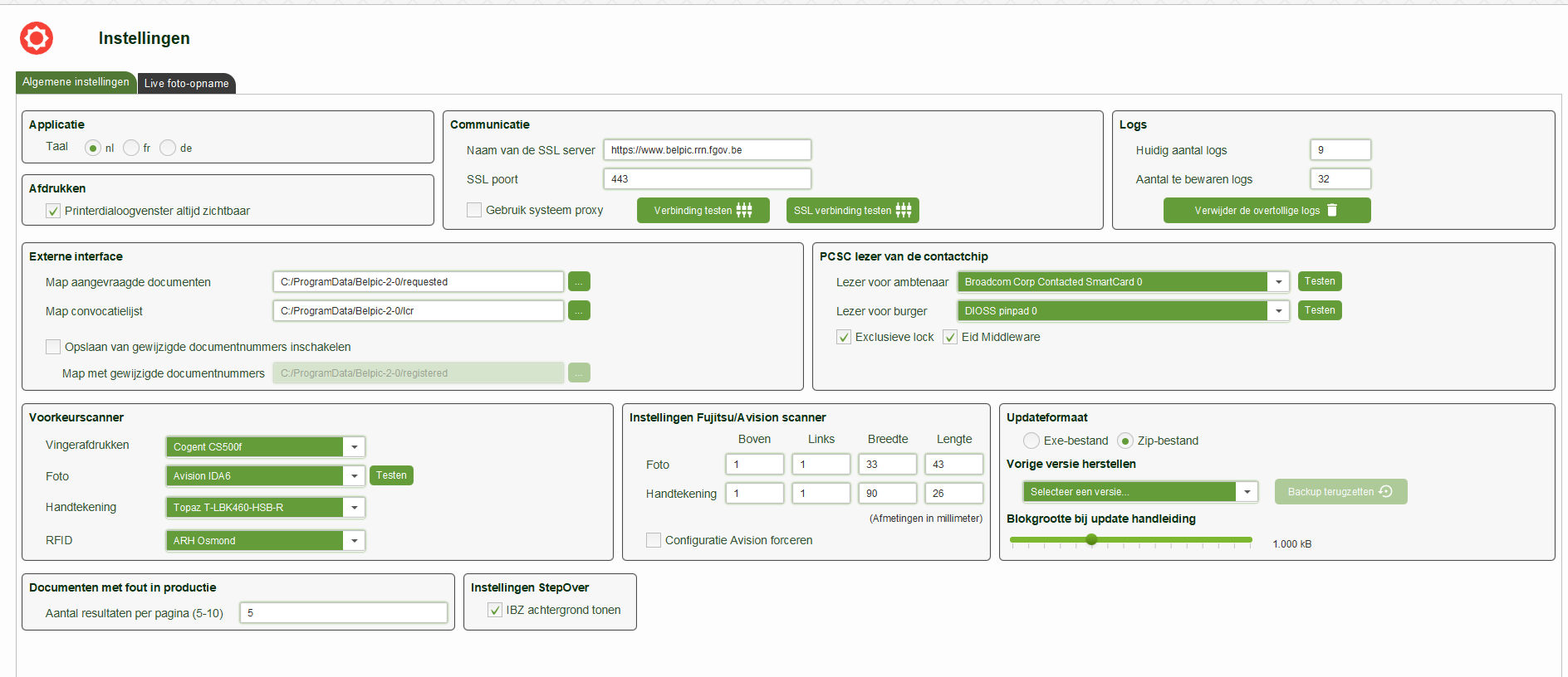 Test de instellingen door Belpic op te starten, instellingen te controleren en doe de test.