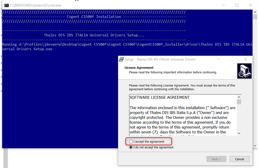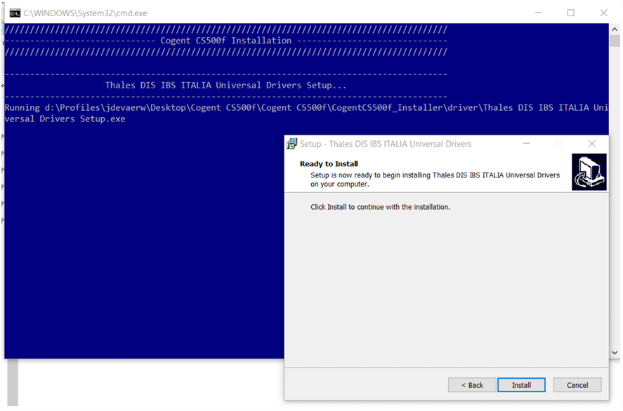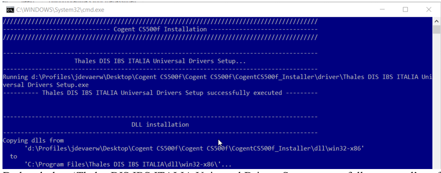 De boodschap ‘Thales DIS IBS ITALIA Universel Drivers Setup successfully executed’ geeft aan dat de drivers met success geïnstalleerd werden.