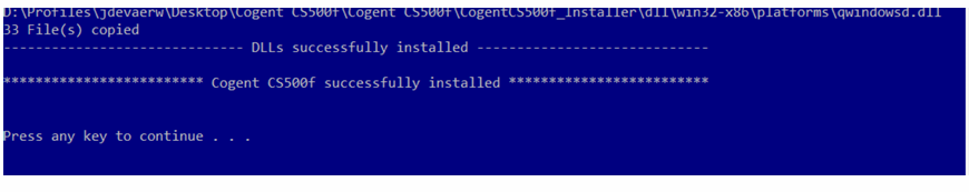 Na het kopiëren van de dll bestanden geeft de boodschap ‘Cogent CS500f successfully installed’ aan dat de installatieprocedure met success uitgevoerd is en dat de Cogent CS500f scanner vanaf nu gebruikt kan worden in Belpic-2-0. De scanner wordt getoond onder de naam ‘Cogent CS500f’ of ‘Cogent CS500f V2’.